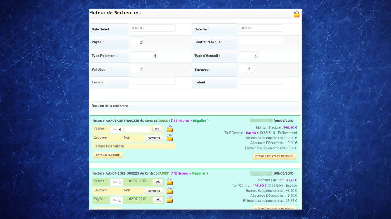 Ecran de suivi de la facturation d’une crèche